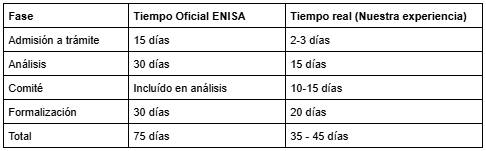 Dato contra oficial: ENISA publica que el plazo medio de resolución es de 2 meses. En mi experiencia con más de 150 solicitudes gestionadas en los últimos 2 años, el tiempo real oscila entre 35-45 días, con picos de 90 días en épocas de alta demanda (septiembre-noviembre, marzo-abril). Planifica tu runway asumiendo el escenario pesimista.