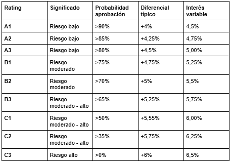 - Rating C (C1-C3): Riesgo más alto dentro de los aprobados. Diferencial entre 5,50% y 6,00%. Variable máximo entre 6,00% y 6,50%. Coste total máximo: ~15%.