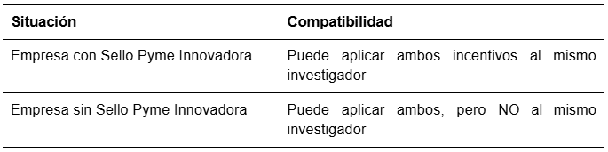 Depende. Si tu empresa tiene el Sello Pyme Innovadora, ambos incentivos son totalmente compatibles y puedes aplicar ambos al mismo investigador. Si no tienes el Sello, puedes aplicar ambos incentivos pero NO sobre el mismo trabajador: debes elegir para cada persona si aplicas deducciones fiscales o bonificaciones de SS.