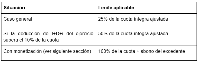 Las deducciones por I+D+i se aplican sobre la cuota íntegra del Impuesto sobre Sociedades, con los siguientes límites: