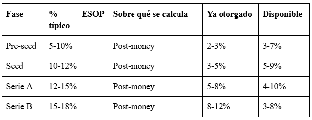 Qué es: El ESOP o Employee Stock Option Plan es un pool o reserva de participaciones que se crea específicamente para poder otorgar opciones de compra de participaciones a empleados clave, executives, advisors y colaboradores críticos como mecanismo de retención de talento e incentivo a largo plazo, alineando los intereses de estas personas con los de los fundadores e inversores porque si la startup crece y sale a valoraciones altas todos ganan proporcionalmente, y cuya característica más importante desde el punto de vista de la negociación del term sheet es que el inversor casi siempre insistirá en que este pool de ESOP se calcule como un porcentaje sobre la valoración post-money fully diluted, no sobre la pre-money, lo cual significa que la dilución que genera la creación del ESOP la asumen principalmente los fundadores y los inversores previos pero no el nuevo inversor que entra en esta ronda porque cuando se calcula su porcentaje de equity con su inversión ya se ha restado previamente el ESOP del denominador. El porcentaje típico de ESOP que pide un inversor institucional en una ronda Seed o Serie A en España 2025 está entre el 10% y el 15% del fully diluted post-money, siendo más común pedir 10% en fases muy tempranas (pre-seed, seed temprano) donde aún no has contratado a muchas personas críticas y subirá a 12-15% en Serie A o posteriores donde ya necesitas atraer CTOs, VPs de Sales, Heads of Product y otros profiles senior que esperan equity significativo como parte de su package de compensación porque sus salarios de mercado son altos y solo aceptarán salarios más bajos si el equity compensa con potencial de upside importante en caso de exit exitoso.