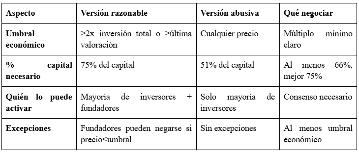- Drag along sin umbral económico (te pueden forzar a vender por una oferta que solo beneficia a los inversores)
