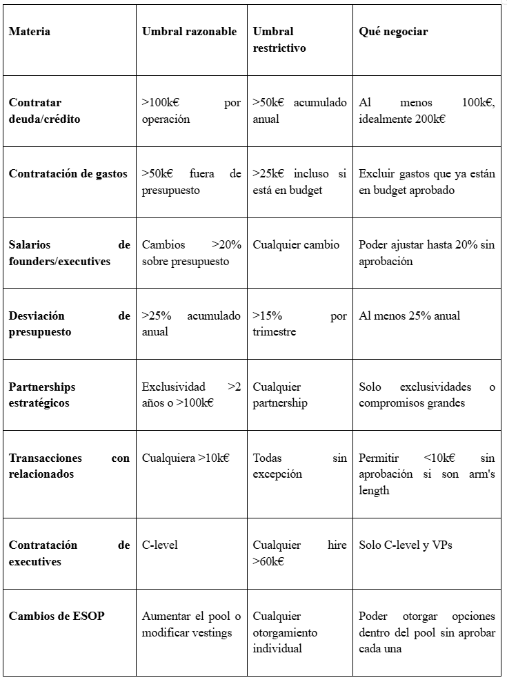 - Perder el control de tu startup por aceptar materias reservadas demasiado restrictivas que bloquean decisiones cotidianas.